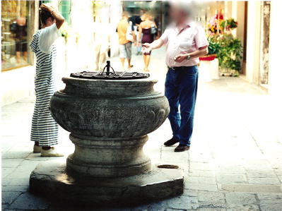 | We cut across Campo Santi Apostoli and take Salizada del Pistor. We turn right at the third intersection, Rio Terà dei Franceschi. On the left-hand side is Cinema Giorgione, the last operating movie theater in Venice. We turn left on Rio Terà Santi Apostoli on the side of the theater, and then right at the second intersection, Rio Terà Barba Frutariol. We cross Ponte Giustinian into Calle de la Madona and walk to the end, Calle Morandi, where we turn right. At the end of Calle Morandi is Calle Varisco, the narrowest street in Venice, spanning only 53 cm. If you walk by the intersection of Calle Varisco and Calle Bandi, in the early morning you would be delighted with the sweet smell of orange-blossom water coming from the ovens of a nearby bakery. |