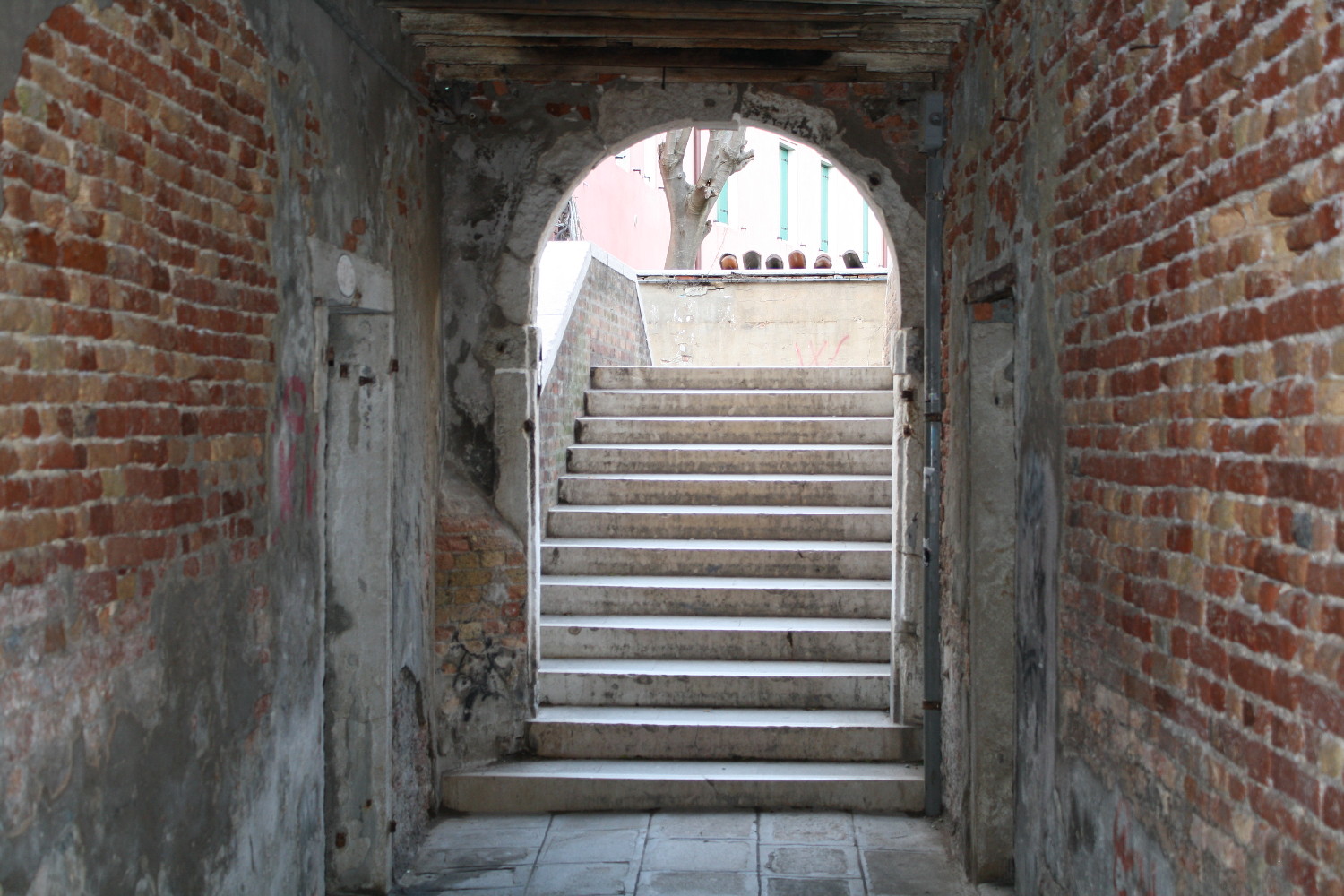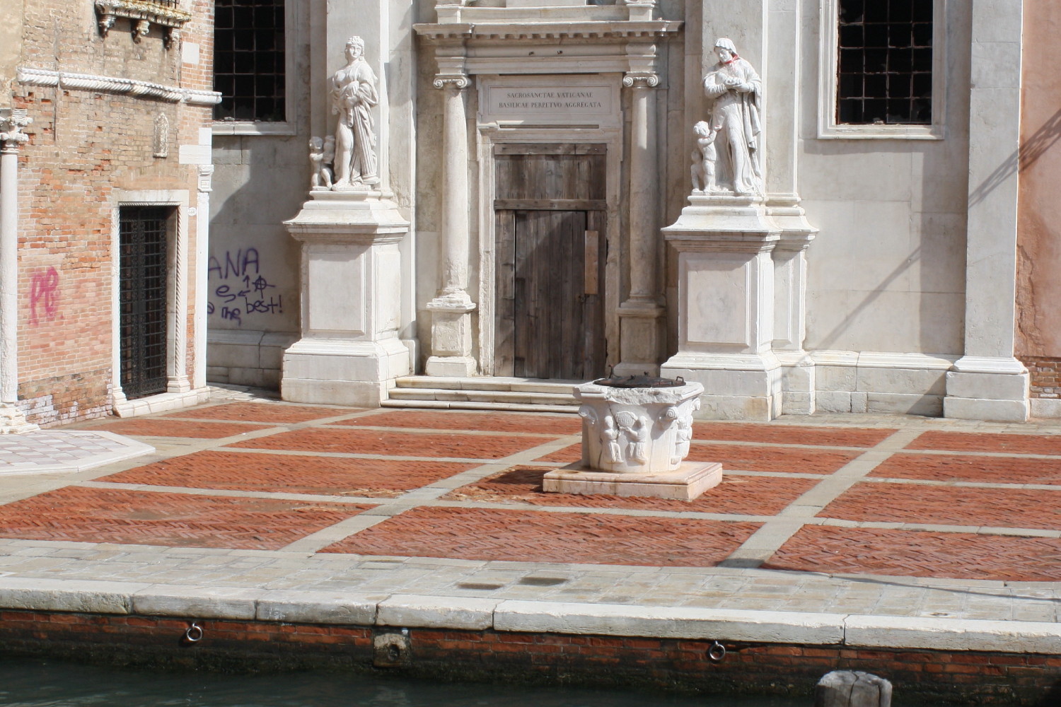 The church is dedicated to Santi Canziano, Canzio and Canzianilla (two brothers and a sister with seemingly unimaginative parents) who suffered martyrdom in Aquileia around the year 300. We go around the church to the other side of the campo and cross the bridge. To our right is Sotoportego del Tragheto. This sotoportego used to be a very busy spot as the old tragheto (one of the oldest in the city, probably in operation since the time of Doge Angelo Participazio in the 9th century) linked Venice with Murano and the north lagoon. Graffiti on the columns of the sotoportego speak of the big freeze of 1864 when it was possible to walk on the lagoon.