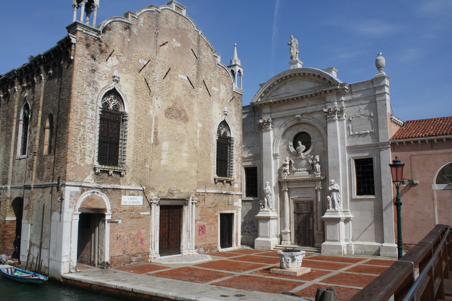 Next to Palazzo Lezze is the Scuola Nuova della Misericordia, now an exhibition hall that can be visited during the Venice Biennale. Across the rio is the Scuola Vecchia della Misericordia, a Gothic building from the middle of the 15th century. Its façade once displayed a magnificent relief of the Madonna della Misericordia now in the Victoria and Albert Museum in London. The beautiful campo, Campo de l'Abazia, still shows the herring-bone brick paving that was once very common in Venice and is now almost extinct. The vera da pozzo is from the 14th century and it once stood in the grounds of the Scuola Nuova della Misericordia. It was then moved to the nearby Corte Nova and finally moved to Campo de l'Abazia at the beginning of the 20th century. It shows reliefs of kneeling friars holding the emblem of the scuola, SMV, with a crown on top. SMV stands for Santa Maria Valverde, another name for the Madonna della Misericordia that makes reference to the old name of the island where the scuola stands. Next to the scuola is the church of Santa Maria Valverde. |