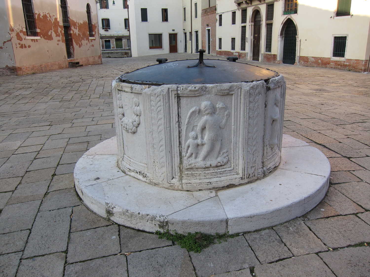 Verona marble wellhead partitioned in two by a wall. In an ugly sort of