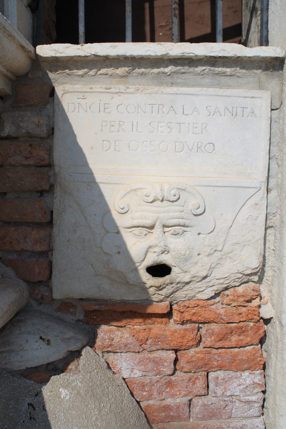 | Right after Rio del Malpaga, from Fondamenta de la Toletta, on the sign that reads "Rio de la Toletta," you can see little balls, made of carpenter's putty or bread dough, adhered to the wall, especially around the "O". Tiziano Scarpa in his whimsical Venice is a Fish, recounts that they are blown by school children using plastic tubes –intended as feet supporters for caged birds– for peashooters. Toletta means wooden plank, probably a reference to a primitive bridge made of this material that stood in this area. |