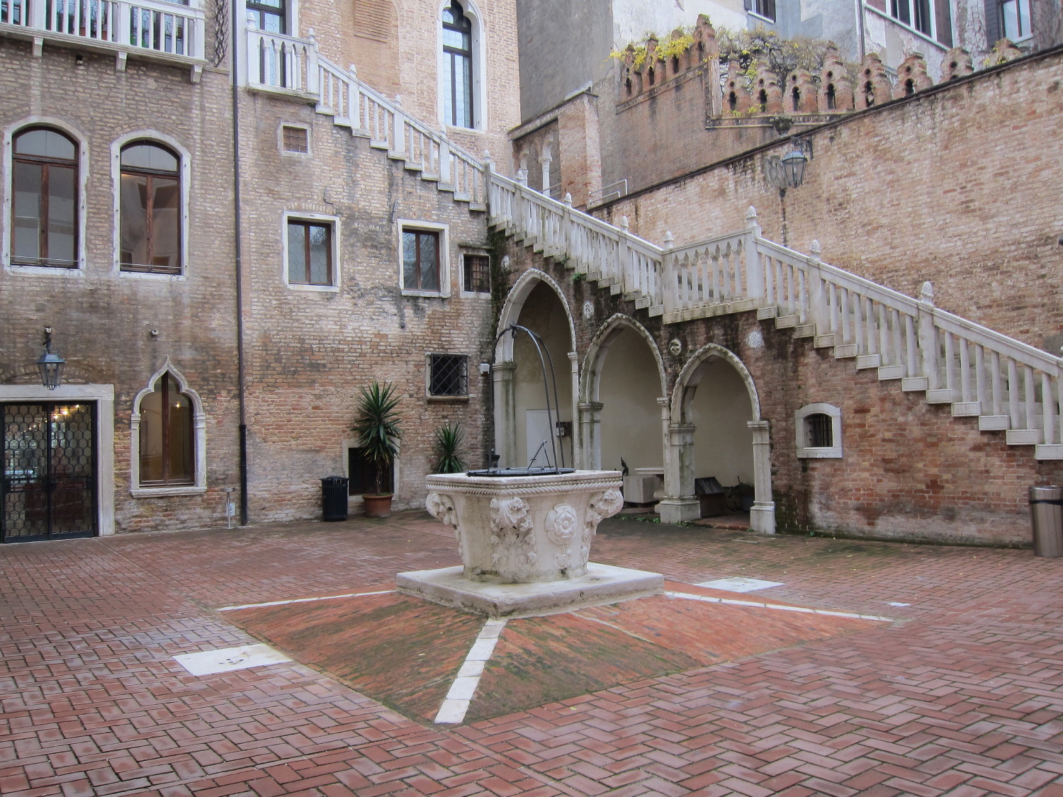 | We cross Ponte del Squero and walk along the Fondamenta del Squero to the end and make a right turn on Calle dei Cerchieri (a cerchiere was a maker of hoops for barrels). On the left hand side we will soon come across a beautiful court, Corte de la Comare. The residence of a midwife in the past. From the end of Calle dei Cerchieri there is an unusual view of the Grand Canal. A picture taken from this corner of Dorsoduro, because of the bend of the Grand Canal, seems to be taken from the other side of the water, San Marco. |