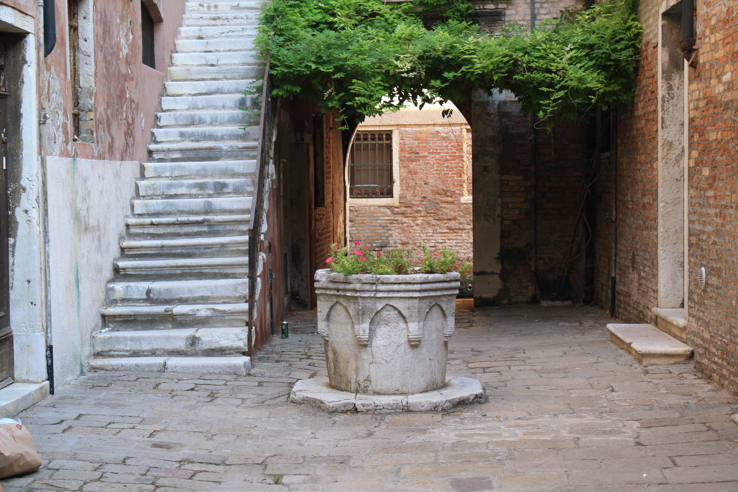We return to the little Ponte del Squero, after which Fondamenta de la Toletta turns, expands and contracts and becomes Calle de la Toletta. Paolo Barbaro in his heart-warming Venice Revealed describes Calle de la Toletta in the following words: "Now the street enters its most musical stretch. We must stop for a moment, and listen and wait [...] In its most musical stretch, the calle widens imperceptibly like an accordion, then immediately folds back in on itself, swerving, turning, and continuing onward four complete times in just a few meters until it reaches Ponte delle Maravegie, the Bridge of the Marvels. And there are as many variations of tone in the air, of timbres, echoes, and vibrations, depending on the varying moods of the conversationalists: in their grievous complaints, comical quips, and sometimes demented asides. Then there is the endless tic-tic of shoes against stone..." One of my favorite sounds is the sound of the running water from the fountain by the canal. |