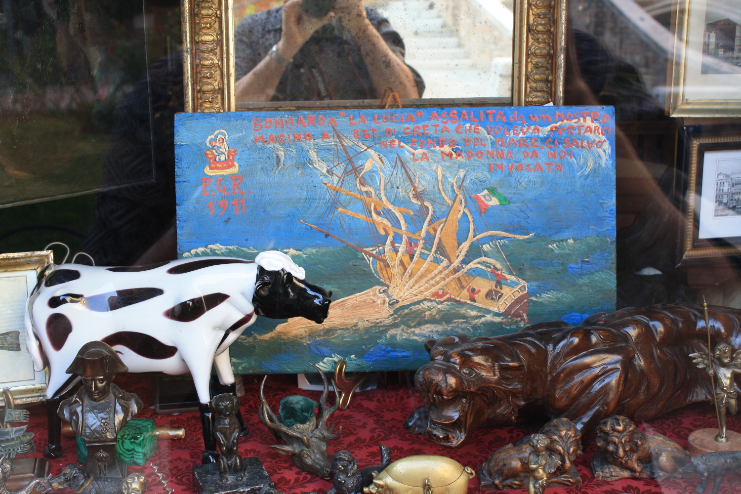 At the corner of the fondamenta and the campo, in front of the canal is a little shop, Signor Blum, that sells joyful architectural models of typical Venetian buildings made of wood. My favorites are the unpainted ones. They give me the excuse to be a kid again. We exit Campo San Barnaba by Sotoportego del Casin dei Nobili. The restaurant Casin dei Nobili is on our right. The covered patio offers one of the friendliest settings to have a delicious Venetian meal. The art on display on the walls is always eye catching. Last time I was there some of pieces seemed to have been made by Van Gogh on LSD. We cross Rio del Malpaga by Ponte Lombardo. | ![]() |