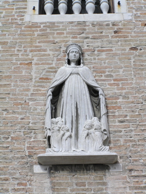 | This relief is above the main portal of the Scuola dei Calegheri e Zavateri (shoemakers and cobblers) on Campo San Tomà (San Polo 2857). It was brought from the church of Santa Maria dei Servi, which was almost totally demolished in the nineteenth century. The crowned Madonna holds her cloak under which ten worshipers kneel. It was recently restored. Dated 1446; 200 x 80 cm. |