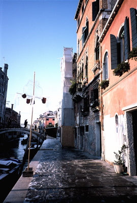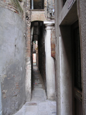 We cut across Campo Santi Apostoli and take Salizada del Pistor. We turn right at the third intersection, Rio Terà dei Franceschi. On the left-hand side is Cinema Giorgione, the last operating movie theater in Venice. We turn left on Rio Terà Santi Apostoli on the side of the theater, and then right at the second intersection, Rio Terà Barba Frutariol. We cross Ponte Giustinian into Calle de la Madona and walk to the end, Calle Morandi, where we turn right. At the end of Calle Morandi is Calle Varisco, the narrowest street in Venice, spanning only 53 cm. If you walk by the intersection of Calle Varisco and Calle Bandi, in the early morning you would be delighted with the sweet smell of orange-blossom water coming from the ovens of a nearby bakery. |