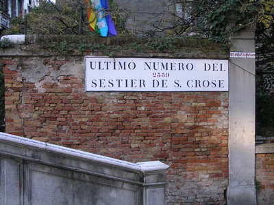 Now we will embark on an irreverent tour of the city. We will not spend much time in the basilica of San Marco, the Doge's Palace or the Rialto bridge, instead we will visit some of my favorite corners, where the pulse of the real city beats in the hurried stride of the Venetians and where few tourists tread. Before we begin our tour, a few words about the geography of the city. Venice is divided into six districts called sestieri. This is a very ancient division dating back to the middle of the XII century, or perhaps before. Each sestiere has its own idiosyncrasy and traditions, even its own manner of speech. To the north and east of the Grand Canal we find the sestieri of San Marco, Castello and Cannaregio. To the south and west: Dorsoduro, San Polo and Santa Croce. The street numbering system is peculiar, if not whimsical, by European standards. The numbers are assigned consecutively often around the block and then they may jump to the other side of the street or two blocks away, one never knows. The end result is that each sestiere is numbered from 1 to the last number of that sestiere, which is usually prominently displayed. For example, the last number of the sestiere of Santa Croce is 2359 (notice the Venetian spelling: "Crose"). Addresses in Venice are given by the sestiere followed by the number; the name of the street is optional. For example, San Marco 1 is the address of the Palazzo Ducale (Doge's Palace). |