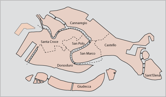 The Giudecca island is technically part of Dorsoduro and Sant' Elena part of Castello but have independent numbering |