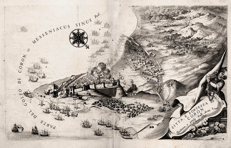 Coron and Modon (now known as Koroni and Methoni) were two important ports on the Peloponnese that the Venetians occupied since the beginning of the 13th century. Only twenty miles apart from each other, the two outposts were essential stepping stones in the maritime routes to the East. All ships returning form the Levant had to stop here and relay information about spice prices, piracy in the Aegean and political unrest in the eastern colonies, information that was quickly dispatched to Venice. Such an important role in Venice's Stato da Mar merited the name of "Eyes of the Republic" to Coron and Modon. The Turks took possession of the two ports in 1500 until almost the end of the 17th century. In 1686 and until 1715 they returned to Venice's rule. ![]() Lighthouse near Methoni ![]() The fortress at Coron around 1685 Crete